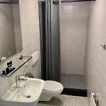Das Badezimmer verfügt über eine getrennte Toilette und eine Dusche sowie über ein Haartrockner und Badelaken.